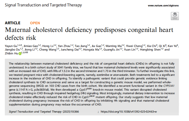 该研究首次在人群与动物模型中系统研究发现孕期胆固醇缺乏是子代CHD的一个重要可干预危险因素,不仅深化了对胆固醇在心脏发育中作用机制的理解,也为未来开展基于胆固醇营养干预的孕期精准预防策略奠定了科学基础。