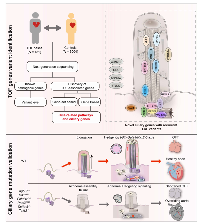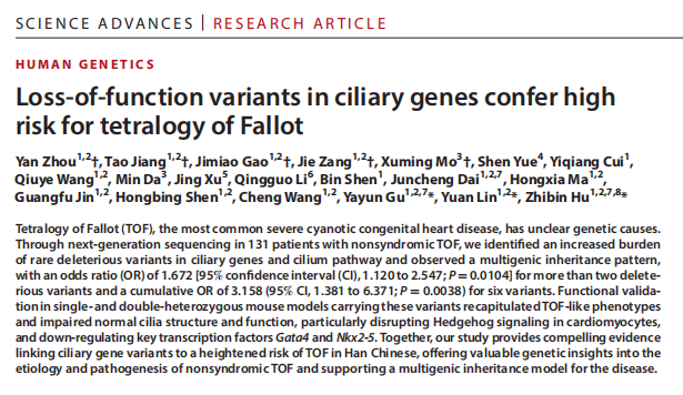 2025年10月10日,南京医科大学胡志斌、林苑与顾亚云团队在Science Advances上发表题为《Loss-of-function variants in ciliary genes confer high risk for Tetralogy of Fallot》的研究论文。该研究整合人群基因组学与小鼠模型,首次在中国汉族人群中系统揭示了纤毛基因功能缺失变异在TOF患者中显著富集,且其寡基因突变模式可大幅提升患病风险,并进一步阐明该过程通过破坏Hedgehog信号通路、抑制心脏关键转录因子GATA4与NKX2-5表达下调的分子机制。